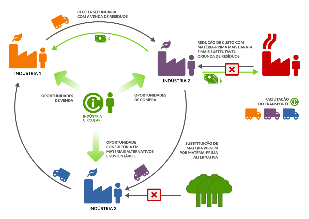 A Indústria Circular promove o reaproveitamento dos resíduos industriais. Nós mapeamos as indústrias e os dados relativos ao consumo de matérias-primas e a geração de resíduos em nossa plataforma, com o objetivo de criar um ecossistema de fluxos de materiais que promove negócios com o reuso e reciclagem desses resíduos. Adicionalmente disponibilizamos uma seleção de empresas de transportes qualificadas afim de agregar valor a solução. Com isso, oferecemos aos clientes a possibilidade de pesquisar os preços para o serviço de transporte. Por fim, realizamos consultorias para identificação de aplicações para os resíduos nos processos industriais. Com esse trabalho de pesquisa, catalogamos em nossa plataforma os tipos de materiais e suas respectivas aplicações inovadoras e sustentáveis.